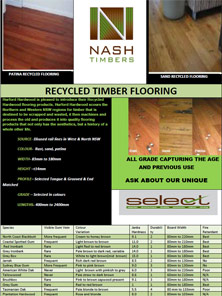 Recycled timber from recycled from power poles, bridges and wharves, which has had a life outside and is predominately Grey Ironbark and Spotted Gum with more imperfections.These timbers are well seasoned but if cut the moisture content from the centre to the outer edges varies quite considerably After the timber is cut it is dried in a kiln so the moisture equalizing process takes place before the timber is re-milled with a tongue & groove & end matched. Colour range creams, tans and reds. Recycled Flooring sizes available are 60 x19mm, 85 x 19mm, 115 x 19mm and 130 x 19mm