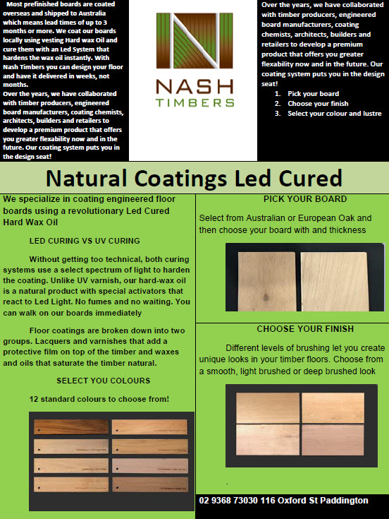Exclusively from NASH TIMBERS, this new and unique select system allows our clients to make an intelligent & informed choice of timber requirements by using our Interactive PDF Program that guides you through different timber options from colour, types of timber flooring and finishes, grade, widths, heights, lengths, durability, hardness & sustainability. All aimed at giving you the most suitable and “intelligent” outcome - To help make your timber selection more process and guided based we take you through a path of chooses which lead you to your ideal floor.